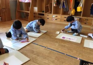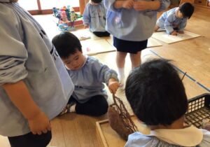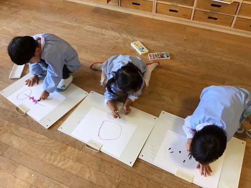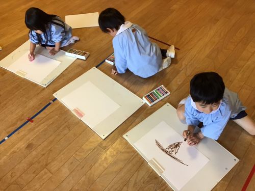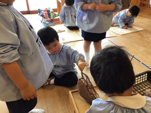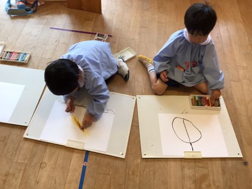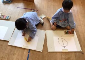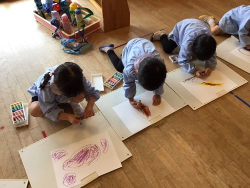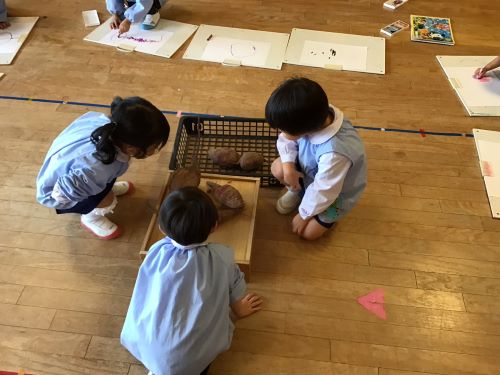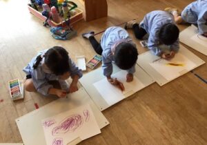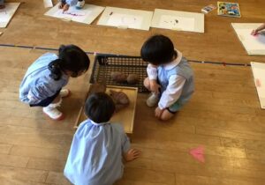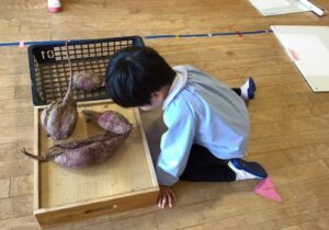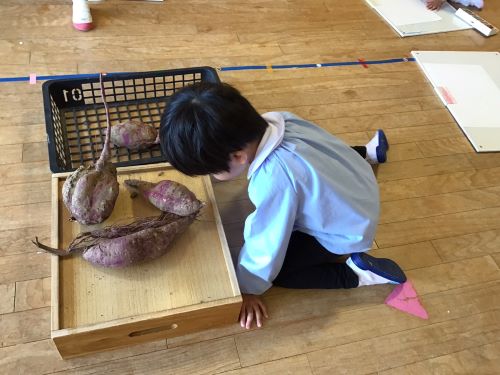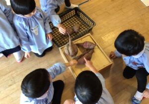鶴ヶ谷幼稚園のちゅうりっぷ組で、先日収穫したさつまいもの観察画を描きました。「土のにおいがするね」「どっしり重いような…軽いような…」「やきいもにするとどんな色になるのかな?」と話しながら真剣に取り組んでいました。描くだけではなく、見たり嗅いだりしたことで、さらにやきいも会への期待が高まったこどもたちでした♪