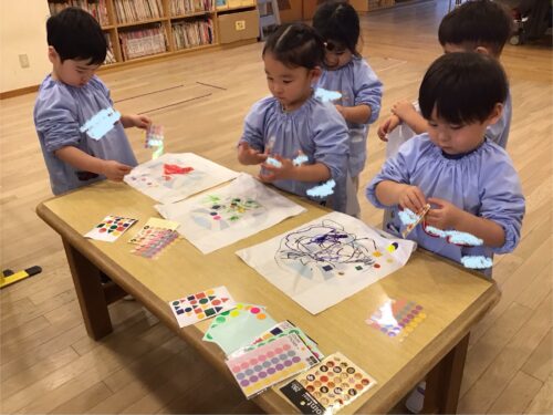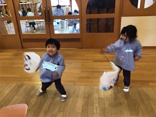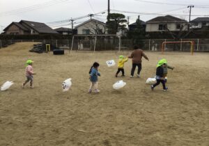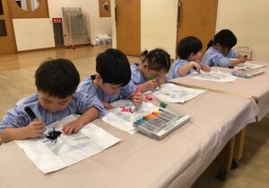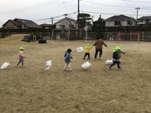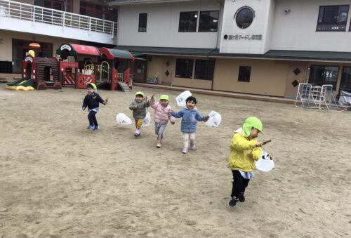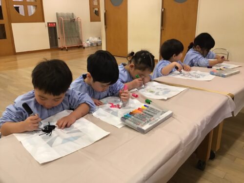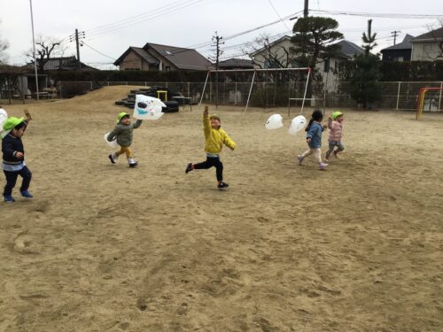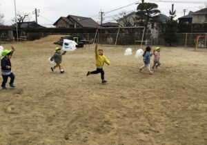 ペンで模様を描いたり、シールをぺたぺた貼ったり…オリジナルの凧が出来上がると、早速外に出て凧揚げに挑戦です…。向かい風、追い風、弱風、強風…丁度良い風の向きや強さを見極めるのはなかなか難しいですが、紐をぎゅっと握りしめて楽しく園庭を走り回っていました。
