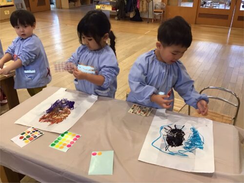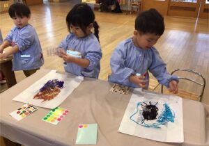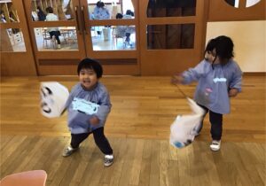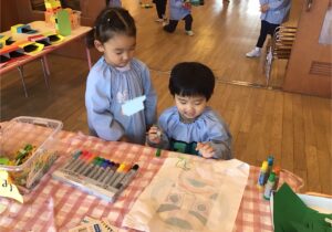 鶴ヶ谷幼稚園では、冬休み明けから、こま回しやかるた取り、福笑いなど、様々なお正月あそびで盛り上がっています。ひよこ のみんなも、凧揚げの凧を自分たちで作りました。