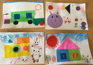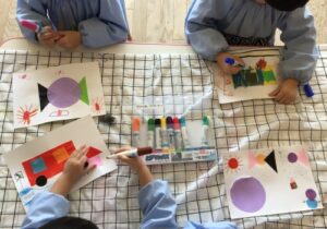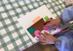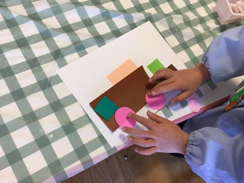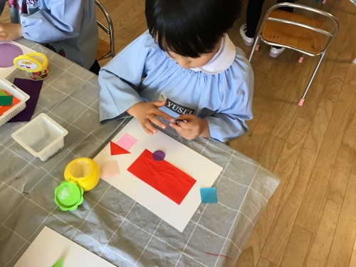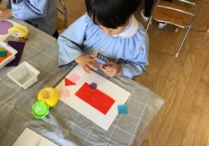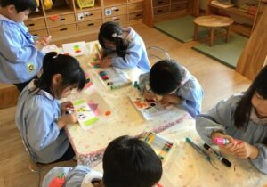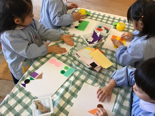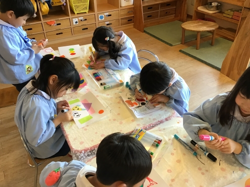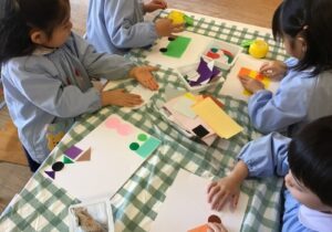 鶴ヶ谷幼稚園の年中組で、3学期の当番表製作をしました。丸・三角・四角を使って「何の形にしようかな」と考えて家やバスなどを表現したり、ペンで模様や絵を描いたりして製作を楽しんでいました。完成した当番表を使って、当番活動を楽しんでいきます。