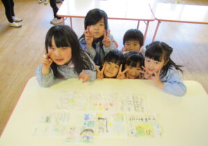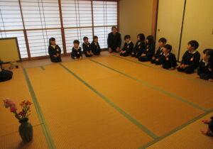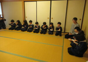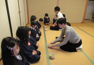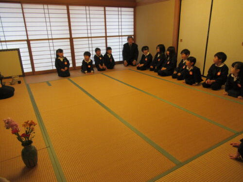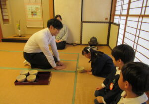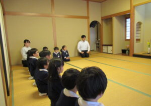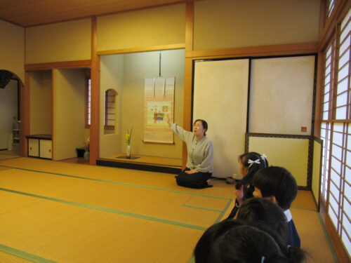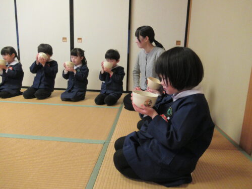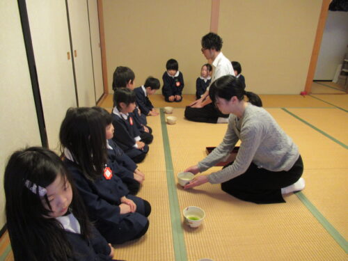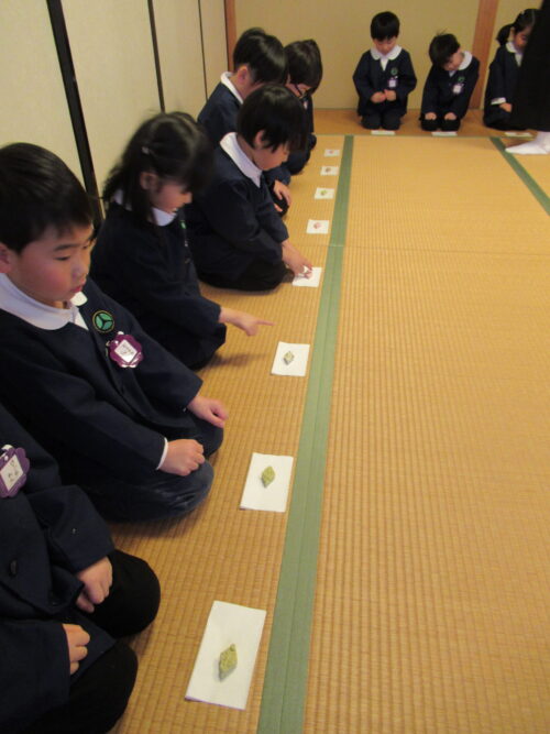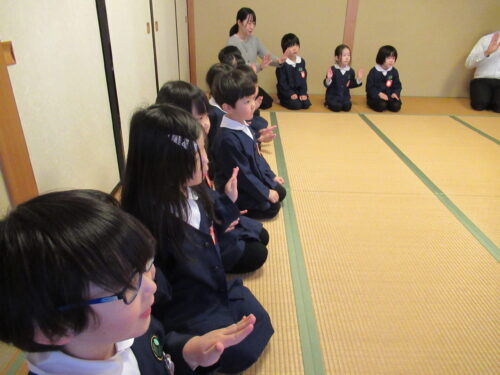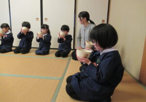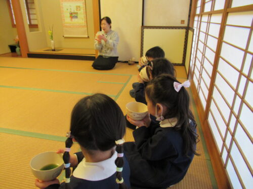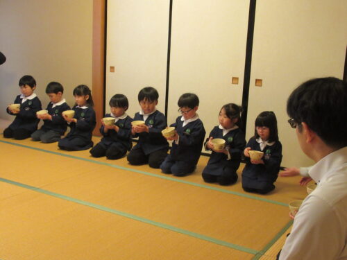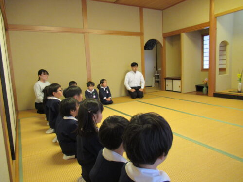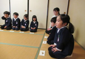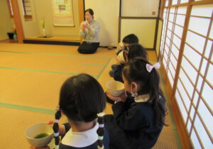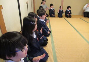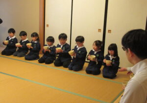 鶴ヶ谷幼稚園の年中組で茶道の時間がありました。今日は初めての茶道の時間ということで、あいさつの仕方や茶室での作法を教えていただきました。お菓子をいただく時に使用した懐紙に今日の茶道の思い出を描いて、お土産として持ち帰っています。「次はいつかな?」と年長組から本格的に始まる茶道の時間を楽しみにすると共に、進級への期待がより高まっていました。