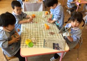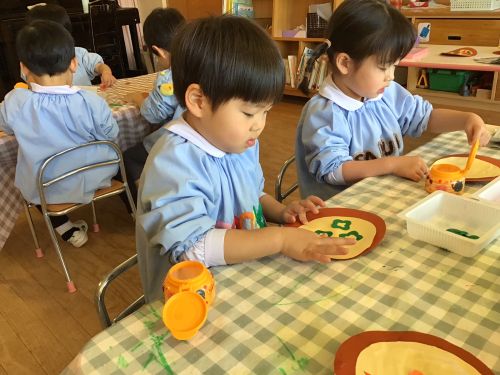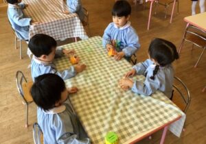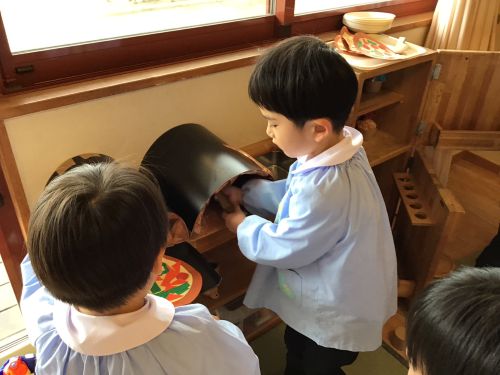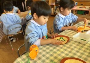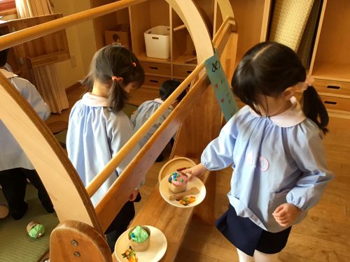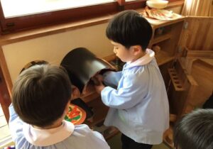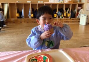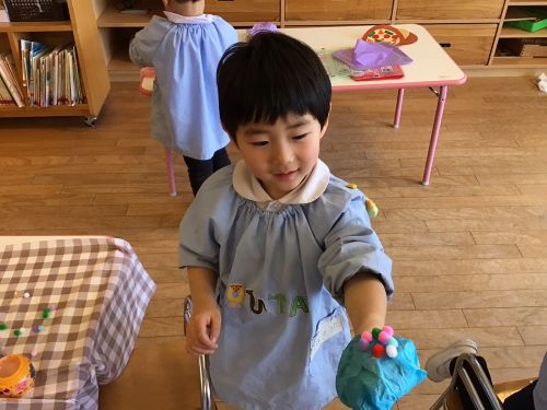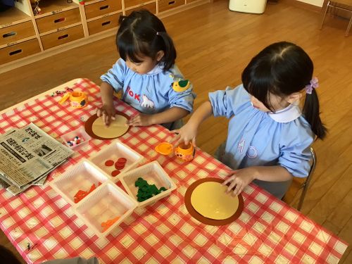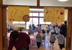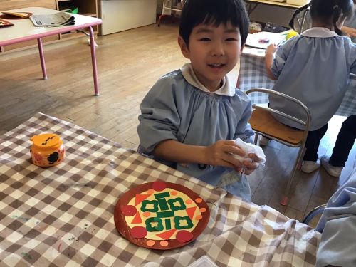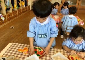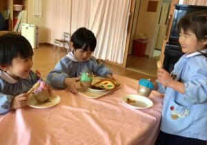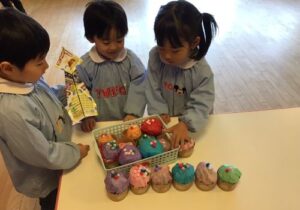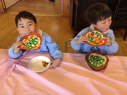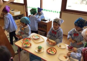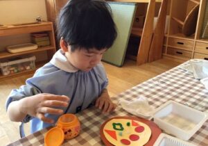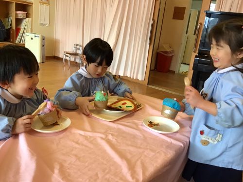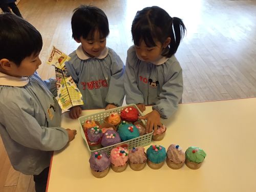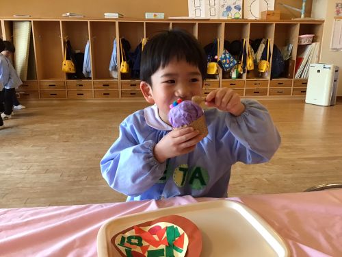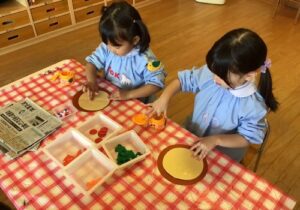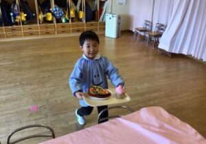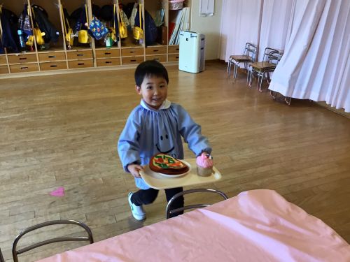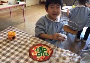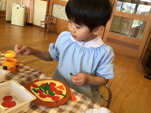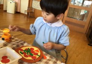 鶴ヶ谷幼稚園の年少組で『お店屋さんごっこ』を行いました。ちゅうりっぷ組は皆で話し合って、ピザ&アイスクリーム屋を開くことにし、様々な素材を使って作るところから始めました。開店準備も皆で行い、いざ開店の時間になると、「いらっしゃいませ!」「ありがとうございました!」「おいし~い♡」と、笑顔溢れる時間となりました♪