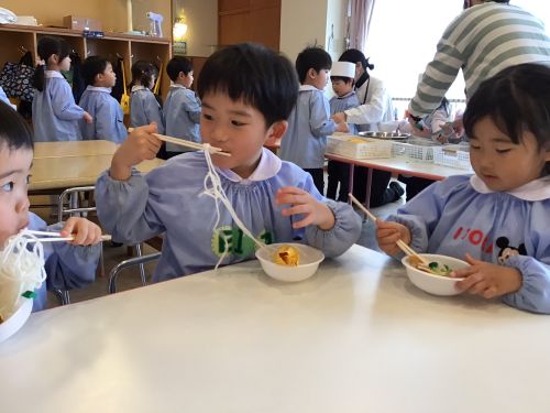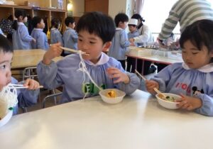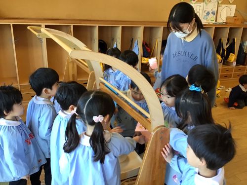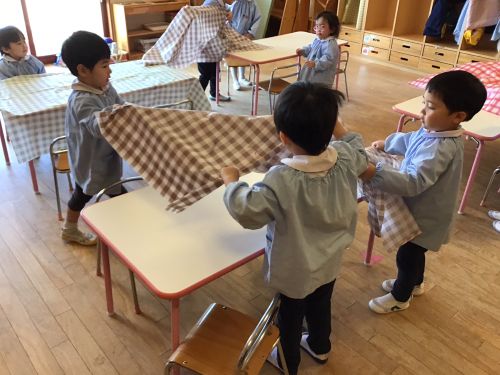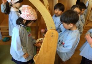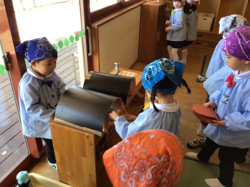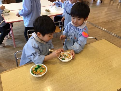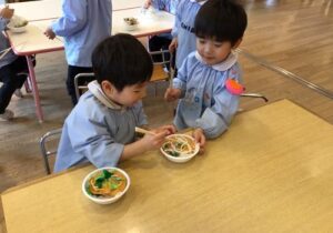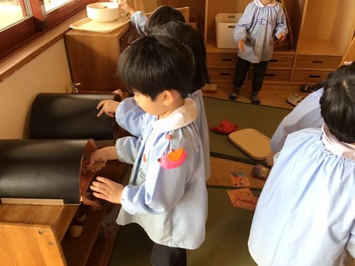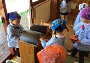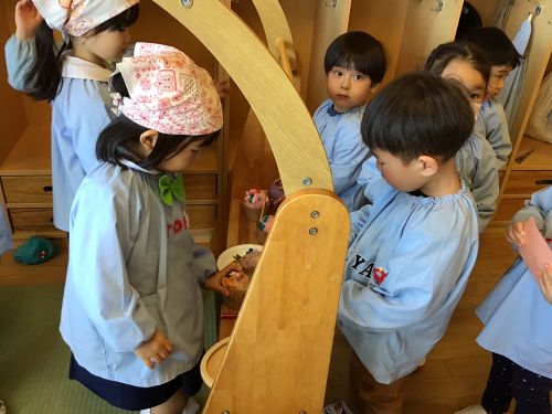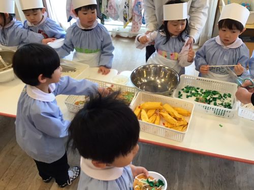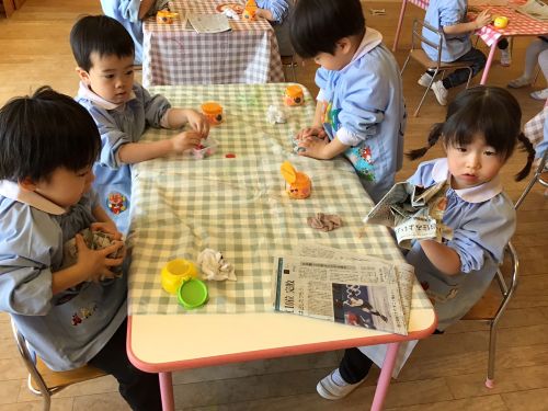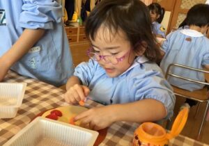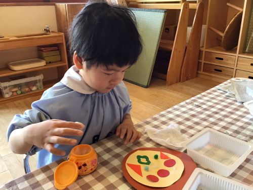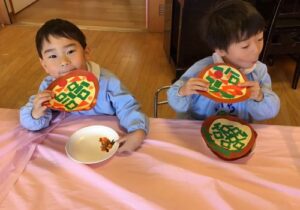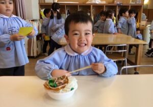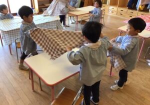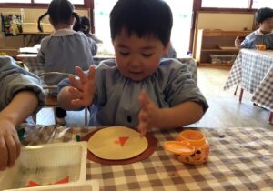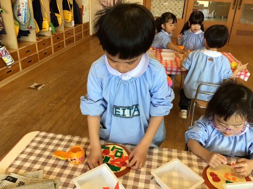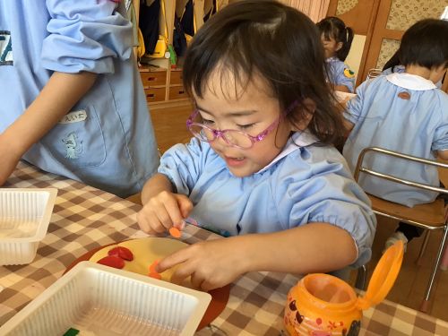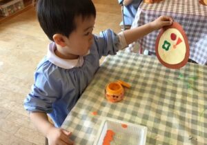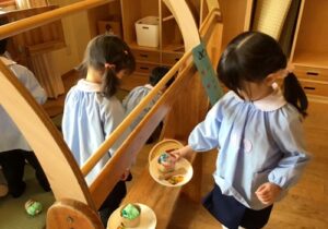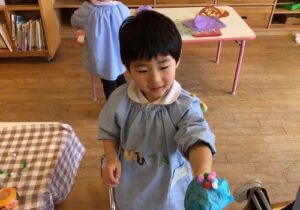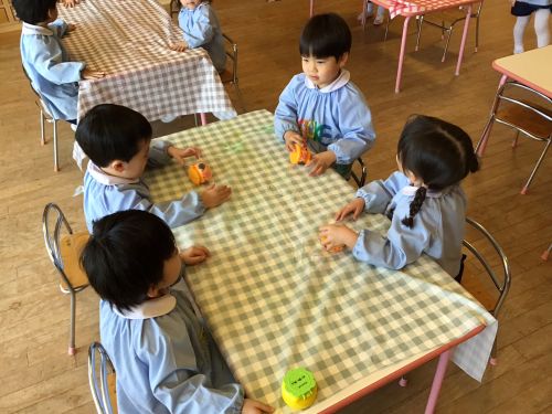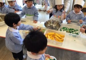 鶴ヶ谷幼稚園の年少組で『お店屋さんごっこ』を行いました。ちゅうりっぷ組は皆で話し合って、ピザ&アイスクリーム屋を開くことにし、様々な素材を使って作るところから始めました。開店準備も皆で行い、いざ開店の時間になると、「いらっしゃいませ!」「ありがとうございました!」「おいし~い♡」と、笑顔溢れる時間となりました♪