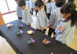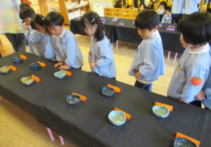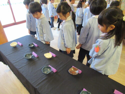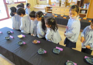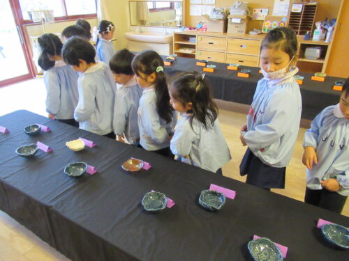 鶴ヶ谷幼稚園の年中組で、土粘土から自分たちで作った茶碗のお披露目会をしました。