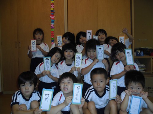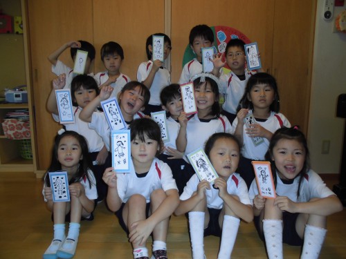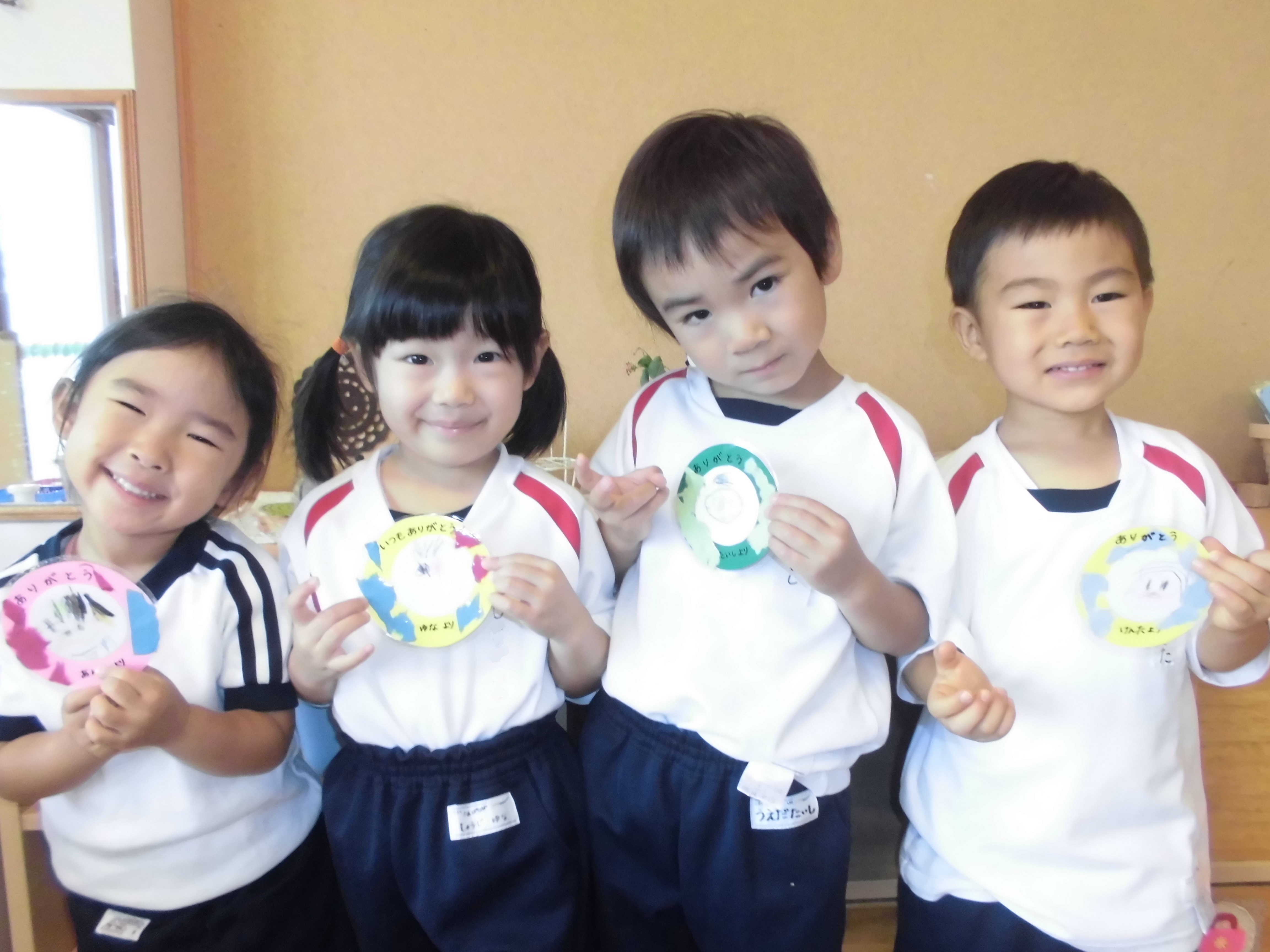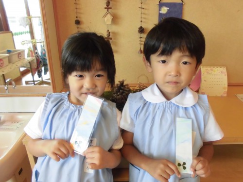 年少組は画用紙と和紙で作ったコースター、年中組は押し花で作ったしおり、年長組は和紙で作ったお軸風の壁掛けです。