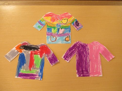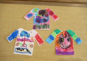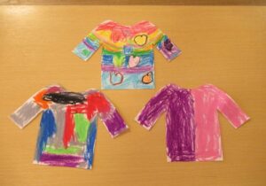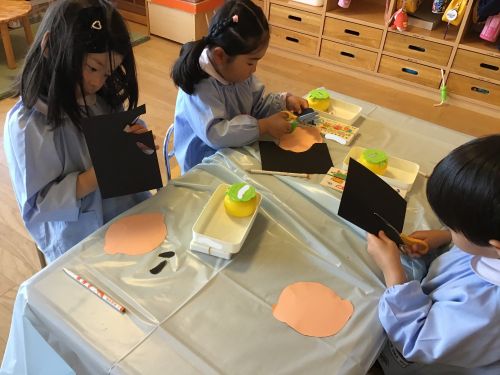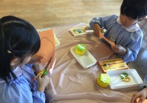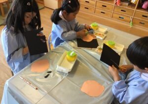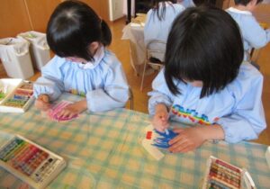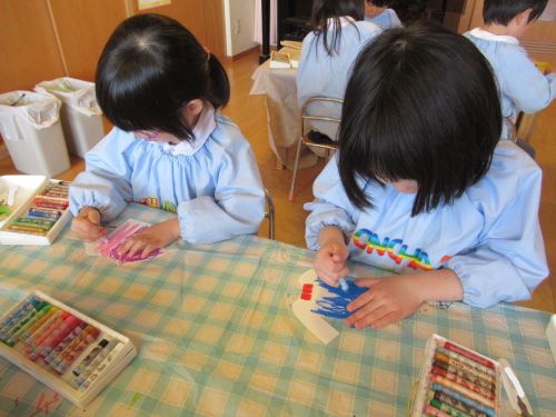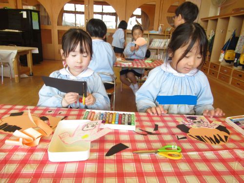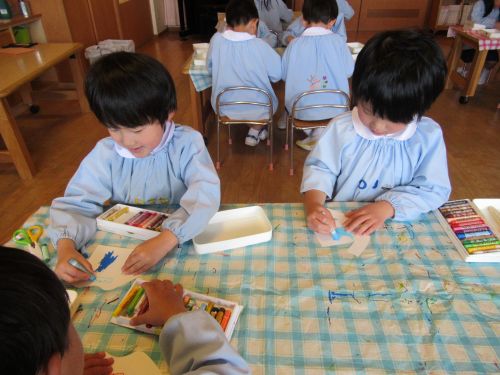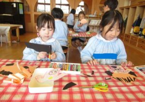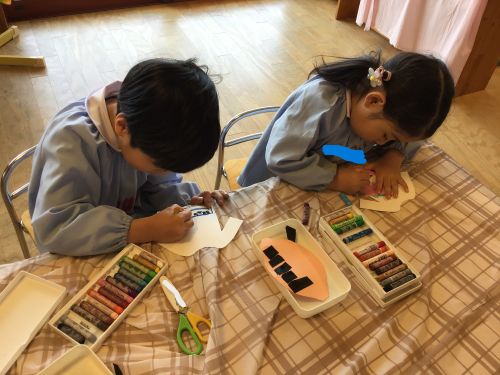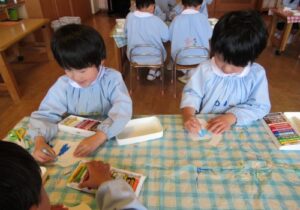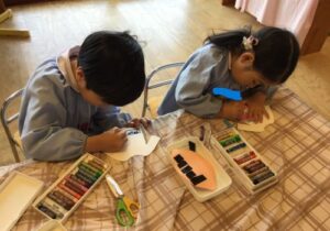 製作中には、「私は結んでいるような髪型にしたよ」「僕の好きな新幹線を描こうかな」などとお友達との会話も楽しみながら進めていました。また、「早くお当番やりたいな」と当番活動への期待も高まっているようです。いよいよ次回、台紙に顔や洋服を貼り付けて完成です☆お楽しみに!