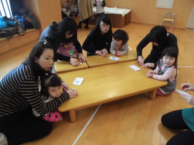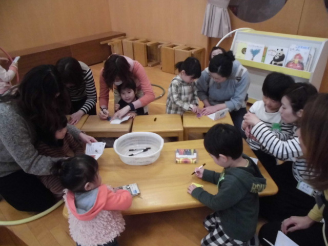 今日で今年度のハミングサークルの活動が最後となります。一年間を振り返ってみんなで“思い出絵本”を作りました。親子でフープに入り、思い出電車に乗りながら春夏秋冬の4つの駅を回りました。どこの駅から回るのか親子で話し合い、ワクワクした様子で出発しました。短冊に願い事を書いたり、折り紙でどんぐりを折ったり、クリスマスツリーにはシールをたくさん貼ったりして装飾しながら絵本を作りました。完成したら園長先生にスタンプを押してもらい、完成です。最後に修了証書を受け取る姿を見て、最初の頃よりもたくましく成長したように感じました。