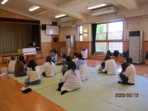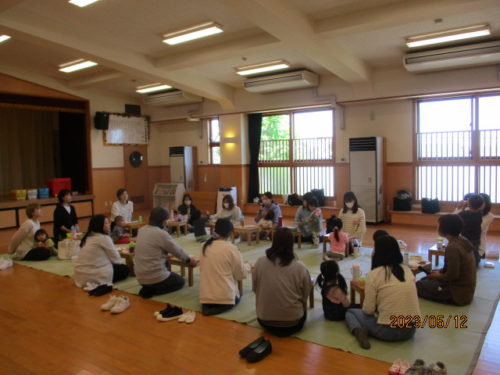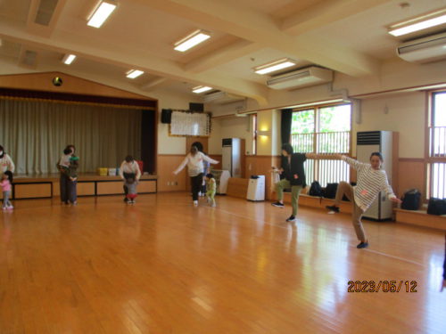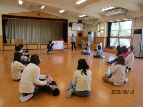 初回は親子での「ふれあいあそび」をし、こどもたちは野菜のきゅうりになったり、動物に変身したりしながらお家の方とたくさん触れ合って身体を動かしました。また、先生の振り付けを真似しながら一緒にうたを歌ったり、笑顔で返事をしたりして、元気いっぱいに活動を楽しんでいました。次回のハミングサークルでは「体操」を行なう予定です。