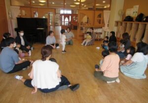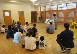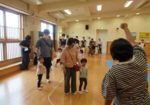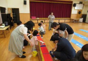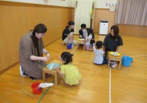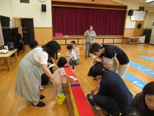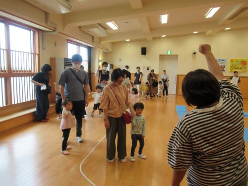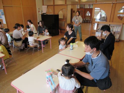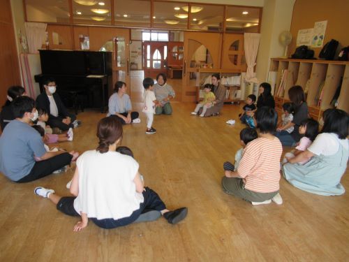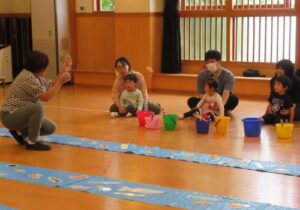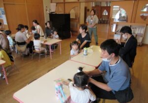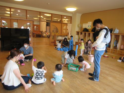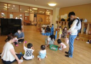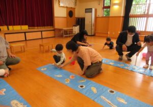 鶴ヶ谷幼稚園で『わくわくきっず』がありました。登園してくると、お気に入りのあそびを見つけて楽しみました。集まりでお名前を呼ばれると元気なお返事を聞かせてくれて、その後は親子で“フルフルフルーツ”に合わせて体操をしました。