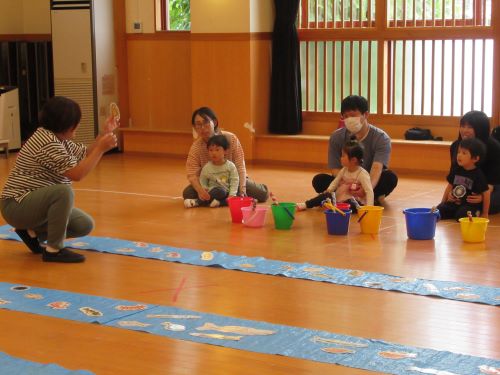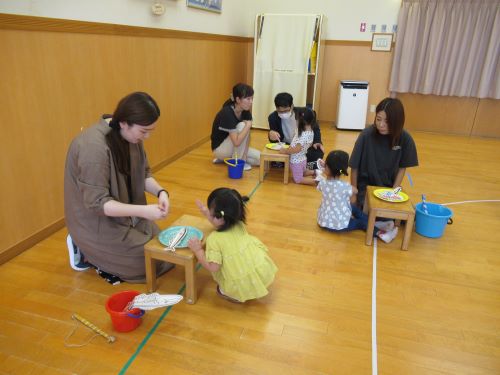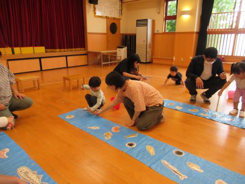 今日の活動は“さかなつりごっこ”でした。魚のお口めがけて餌を近付けて上手に釣っていました。たくさん釣った魚はグリルで焼いていただきまーす!お箸とお皿でもぐもぐ、にこにこ♪