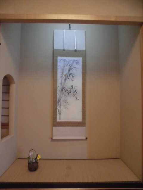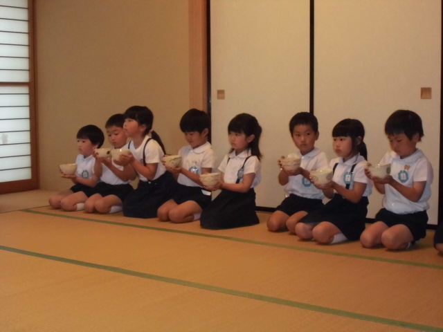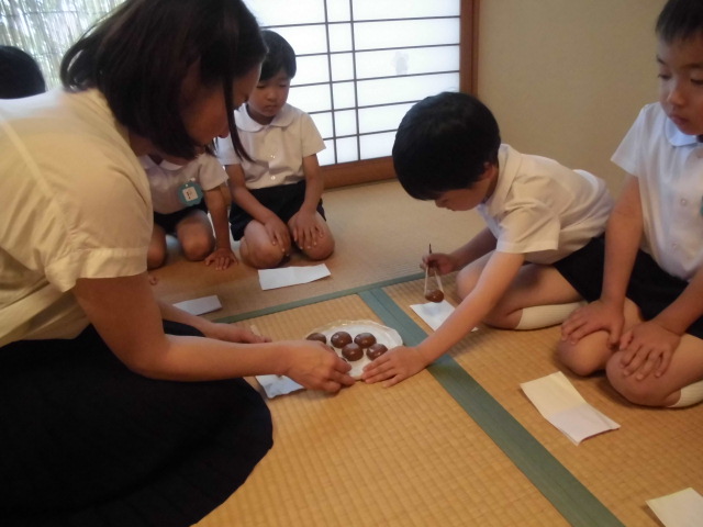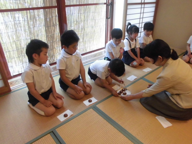 年長組になって二回目の茶道の時間では、「竹に雀」のお軸のお話を聞きました。突然降ってきた雨にどうすれば良いかと考えた雀たちは、竹の葉の下で雨宿りをすることを思いつきました。このお軸を通して、何か困ったことがあったとき、まず自分で考えてみることの大切さを皆で考えました。また、お菓子は「黒砂糖まんじゅう」です。今回は箸を使っておまんじゅうをとり回しました。「お先に」「どうぞ」のあいさつや、箸の扱い方について、丁寧に取り組んでいました。茶道の時間が終わり、昼食の時間には「箸の持ち方は、こうだよね?」とさっそく挑戦する姿が見られました!次回の茶道の時間も心待ちにしているようです。