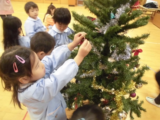 預かり保育のこどもたちとクリスマスツリーを飾りました。こどもたちは、「このリボンここに飾ろうかな?」「雪が降ったみたいに綿もつけよう!」と考えながら行っていました。大きなツリーに沢山飾り付けをし、最後に電飾を点灯すると「きれーい!」「早く皆に見せたいね!」と喜んでいました!鶴ヶ谷幼稚園ではクリスマスのうたやダンスを踊っており、クリスマスの雰囲気を味わっています。12日にはクリスマス会も行いますので、こどもたちと楽しめるようにしていきます!