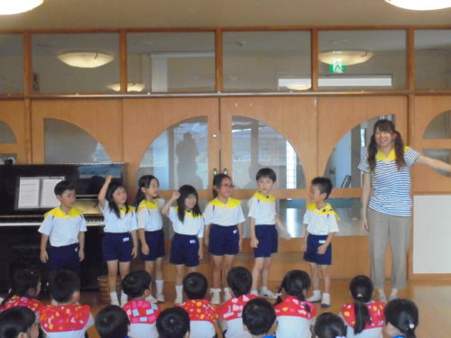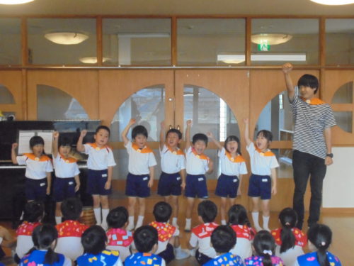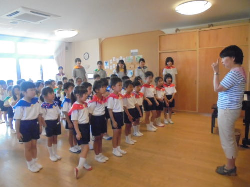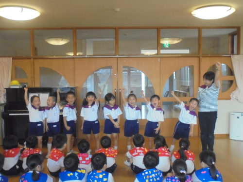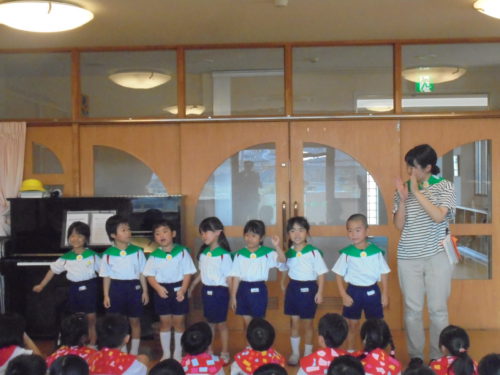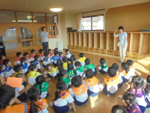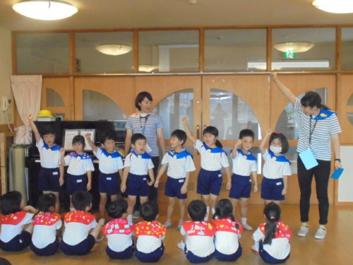 グループごとに手作りをしたセーラーカラーを身につけ「夕べのつどい」に参加しました。船長さんに「みんなと力を合わせてがんばります!」と元気いっぱいあいさつをして冒険に出発しました。