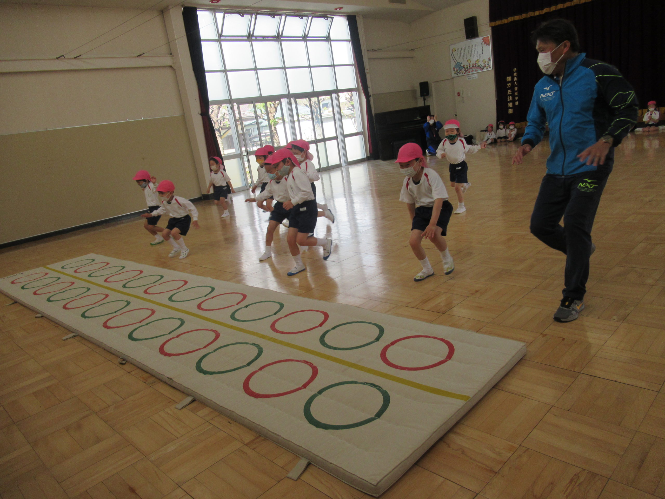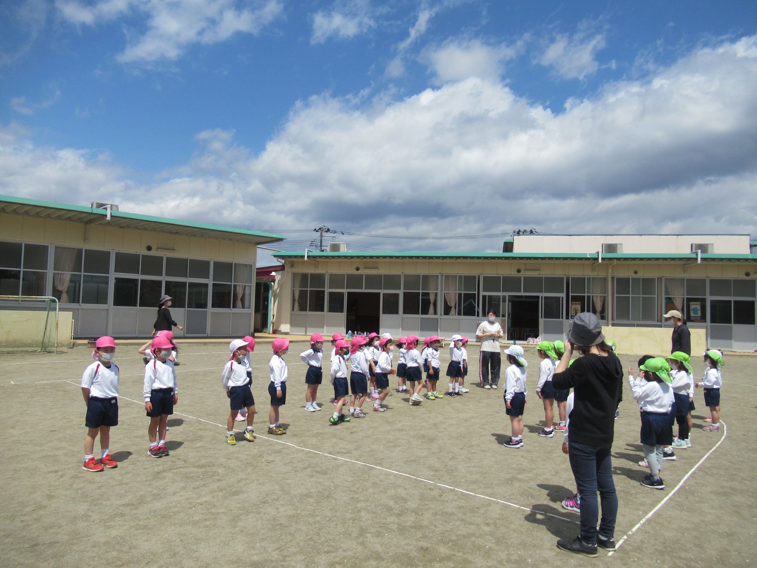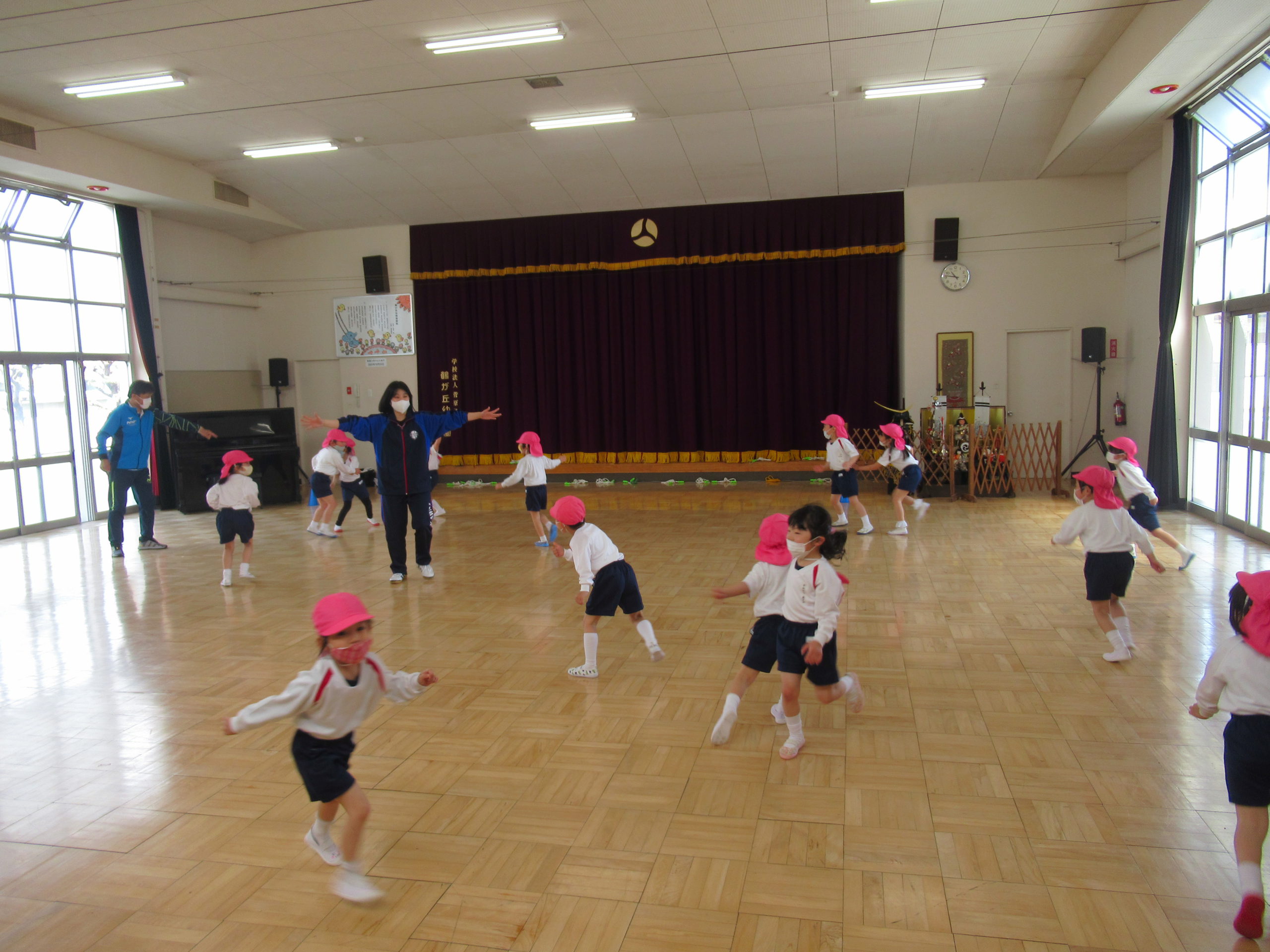 鶴ヶ谷幼稚園の年長組は、今年度初めての体育の時間を姉妹園の鶴が丘幼稚園で行ないました。こどもたちは朝から「鶴が丘幼稚園、久しぶりだね」「今日の体育はどんなことをするのかな」と友達同士で話をして、とても楽しみにしていました。体育の時間が始まると、動物に変身したり鬼ごっこをしたりし、のびのびと身体を動かして遊ぶことができました。また、体育の時間の後には鶴が丘幼稚園の年長けやき組の友達と広い園庭で、一緒にバナナ鬼ごっこをしたり、固定遊具で遊んだりと楽しい時間を過ごしました。