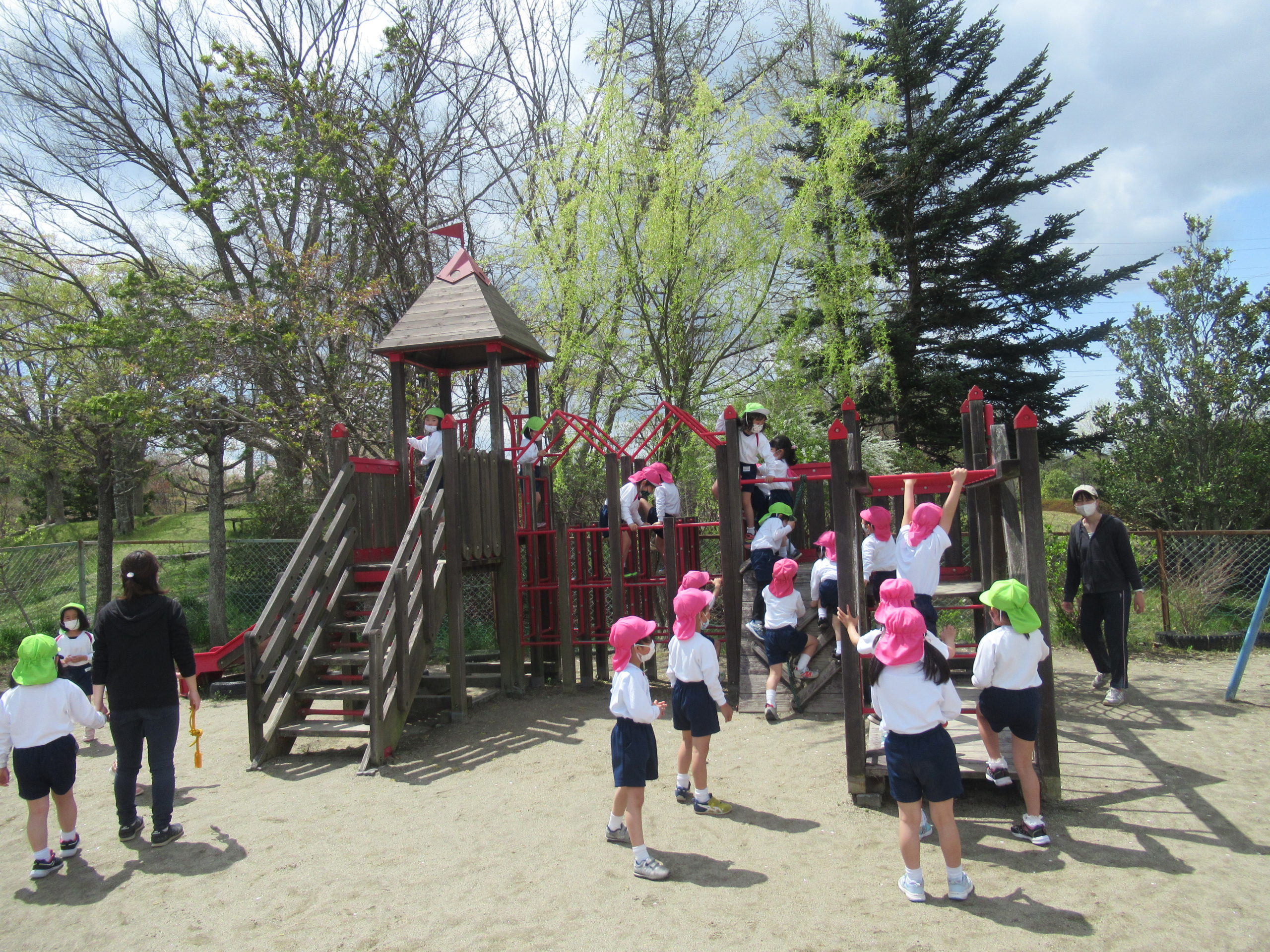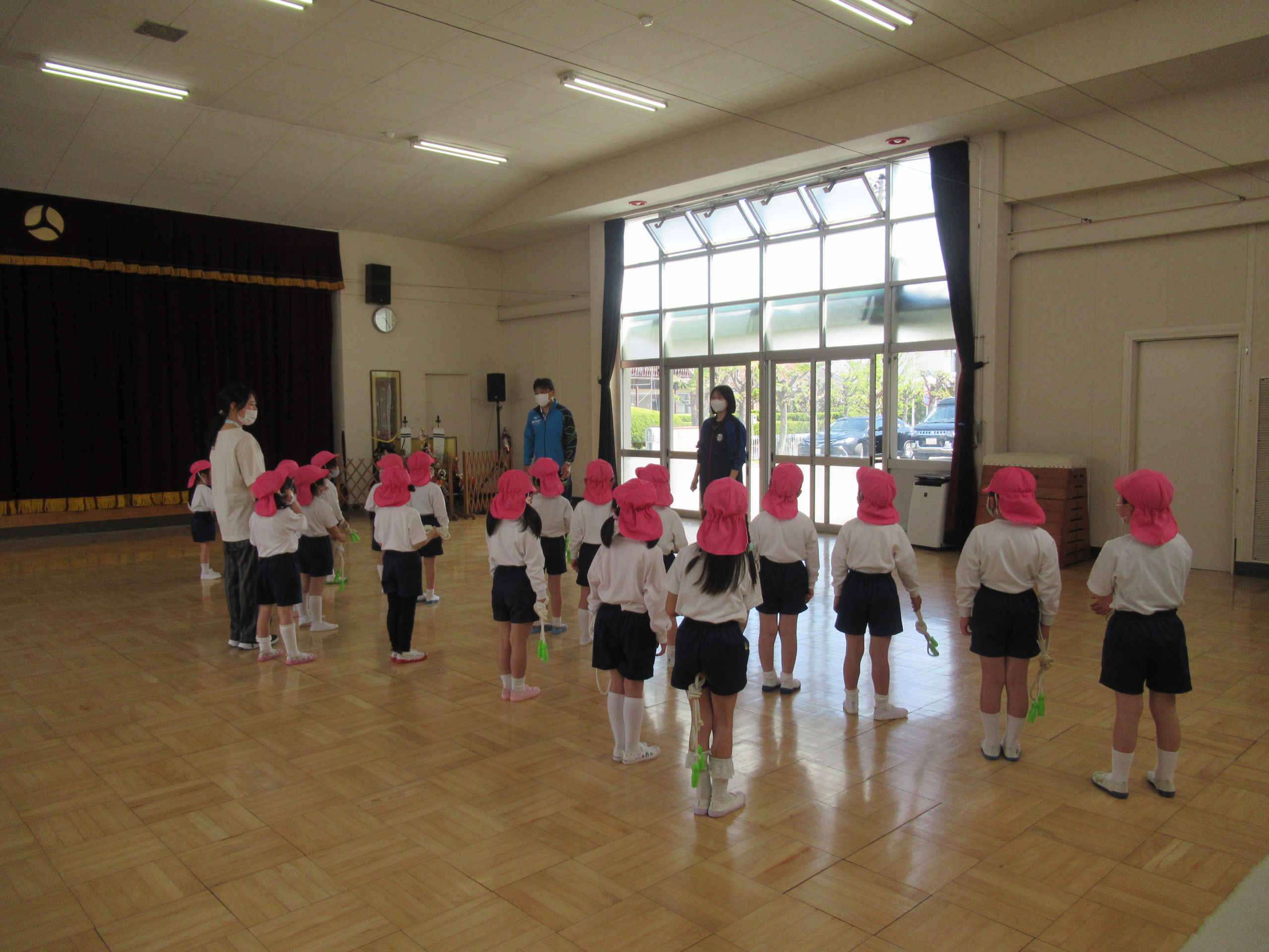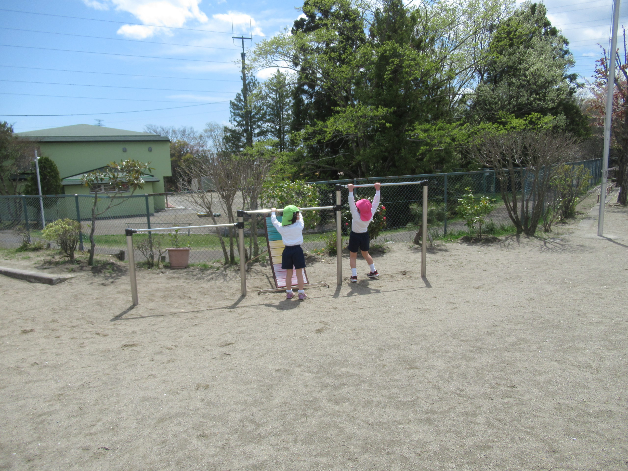 鶴ヶ谷幼稚園の年長組は、今年度初めての体育の時間を姉妹園の鶴が丘幼稚園で行ないました。こどもたちは朝から「鶴が丘幼稚園、久しぶりだね」「今日の体育はどんなことをするのかな」と友達同士で話をして、とても楽しみにしていました。体育の時間が始まると、動物に変身したり鬼ごっこをしたりし、のびのびと身体を動かして遊ぶことができました。また、体育の時間の後には鶴が丘幼稚園の年長けやき組の友達と広い園庭で、一緒にバナナ鬼ごっこをしたり、固定遊具で遊んだりと楽しい時間を過ごしました。