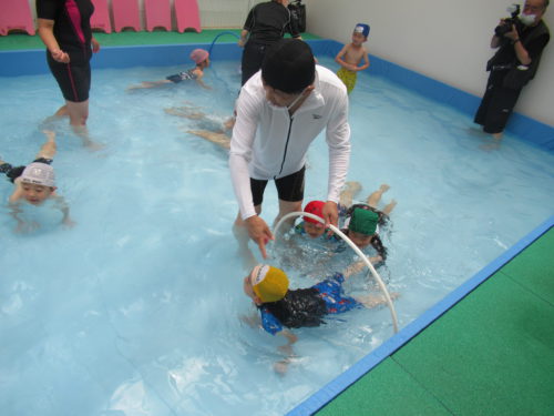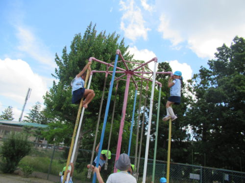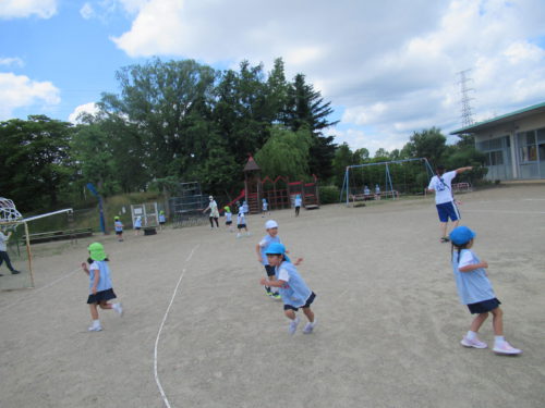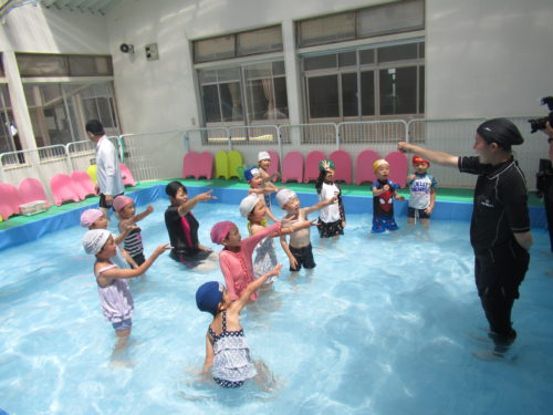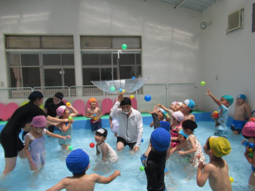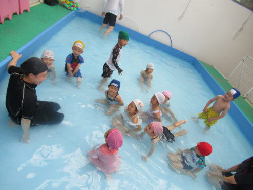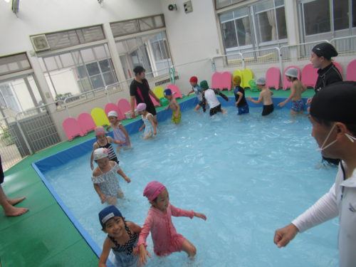 鶴ヶ谷幼稚園の年長組で、プールの活動を行ないました。前日から楽しみにしていたこどもたちは、てるてる坊主を作り、晴れて暑くなるのを願っていました。実際にプールに入ってみると、「冷たくて気持ちいいね」「顔を水につけられるようになったよ」と友達同士で話しながら、プールの中を走ったり宝探しをしたりして楽しむことができました。「次はいつ入れるのかな?」と次回のプールの時間を楽しみにする声も聞かれました。また、その後は鶴が丘幼稚園のけやき組さんと一緒に、すいか鬼や戸外あそびをして楽しく遊ぶことができました。