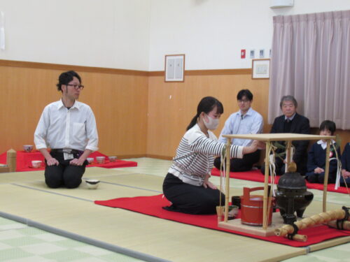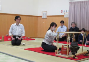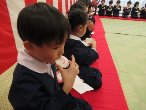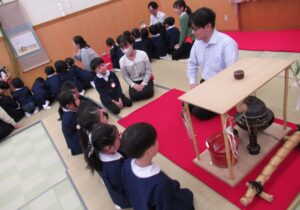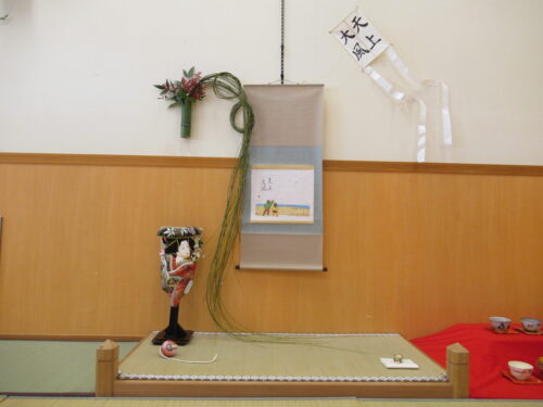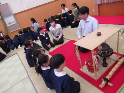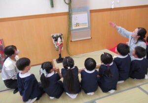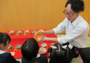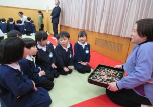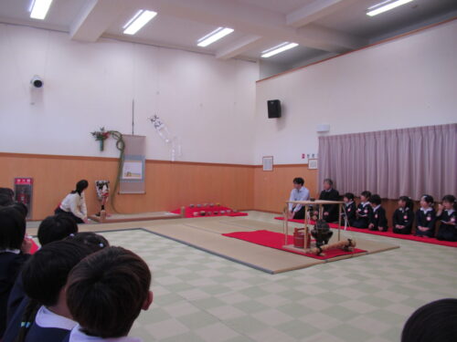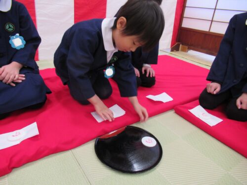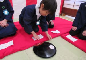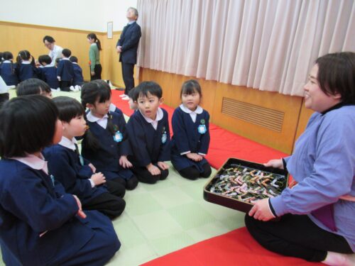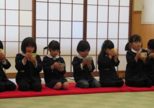 鶴ヶ谷幼稚園の年長組で、新年を祝う茶会『初釜』を行いました。新年の特別な茶会ということで、こどもたちは「いつもの茶道の時間とは何が違うのかな?」と、期待を膨らませていました。教師のお点前を見ながら、亭主と正客のやりとりに耳を傾け、いろいろな道具や飾りの意味を興味深く聞いていました。次回は年長組最後の茶道の時間になります。幼稚園で経験した茶道を皆で振り返っていきます。