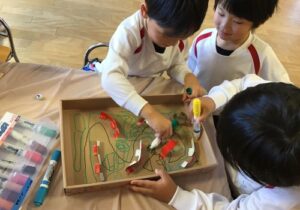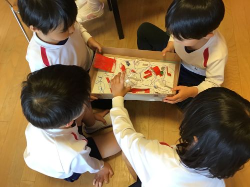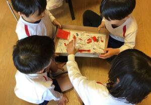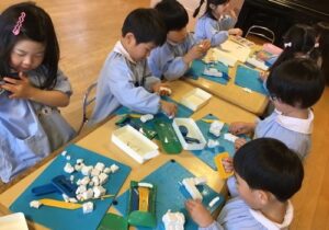 鶴ヶ谷幼稚園のふじ組では、そんな雨の日でも様々な室内あそびで盛り上がっています。