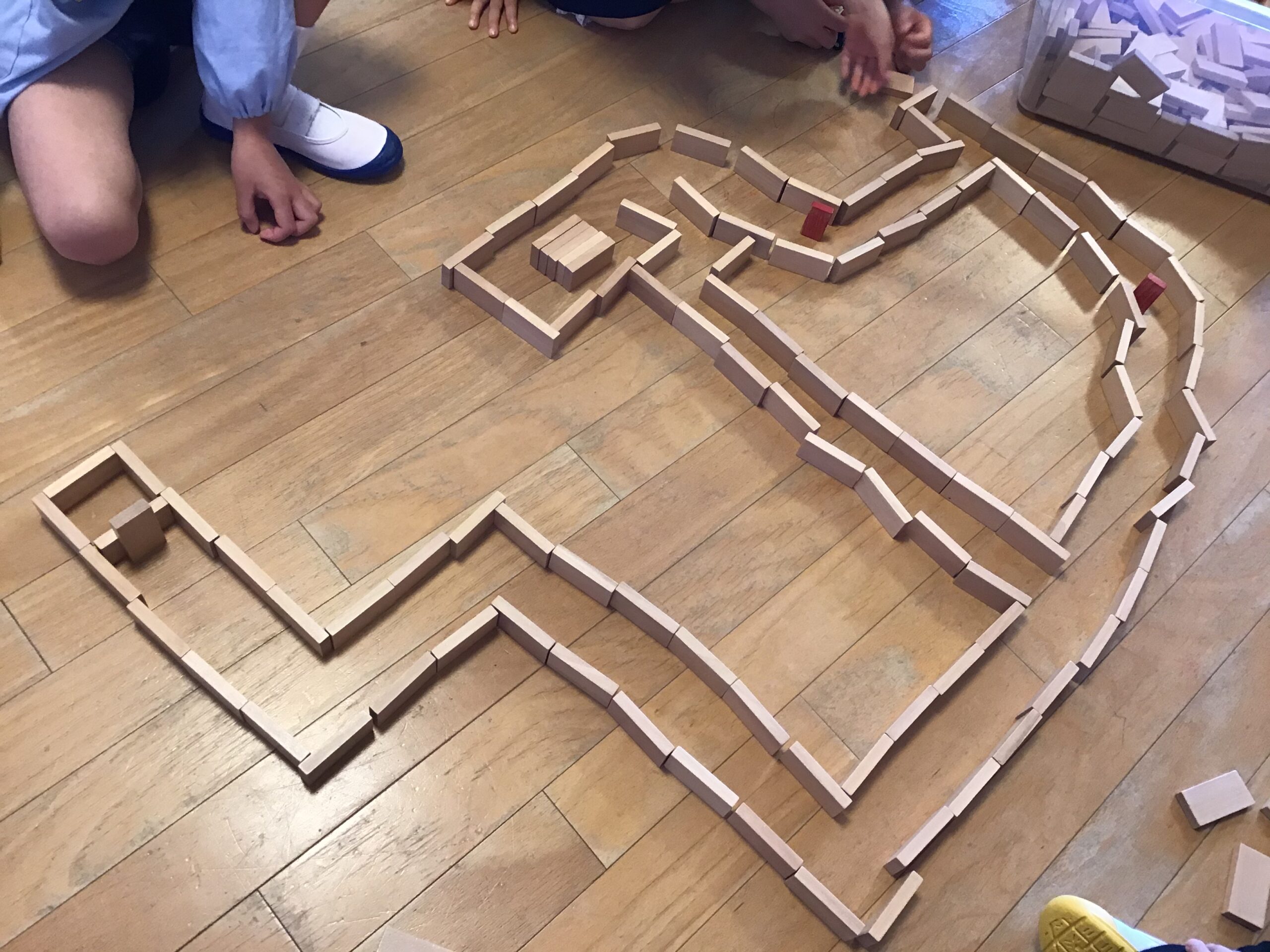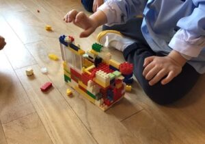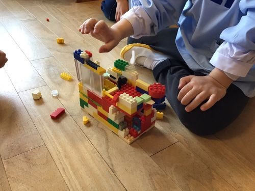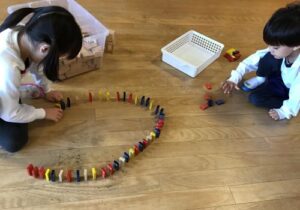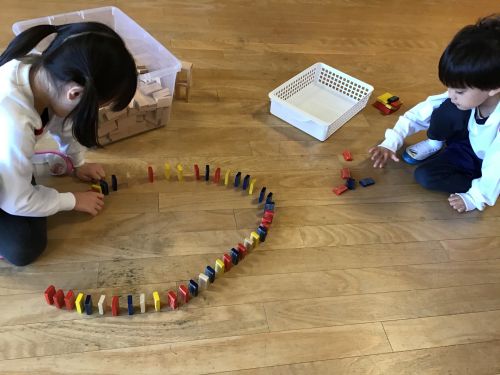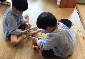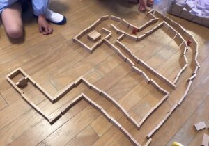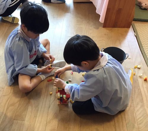 友達と協力をして積み木を並べたり、ブロックで思い思いに作品を作ったり、ビー玉転がしの台を作って楽しんだり…様々なあそびをして楽しく過ごしています。
