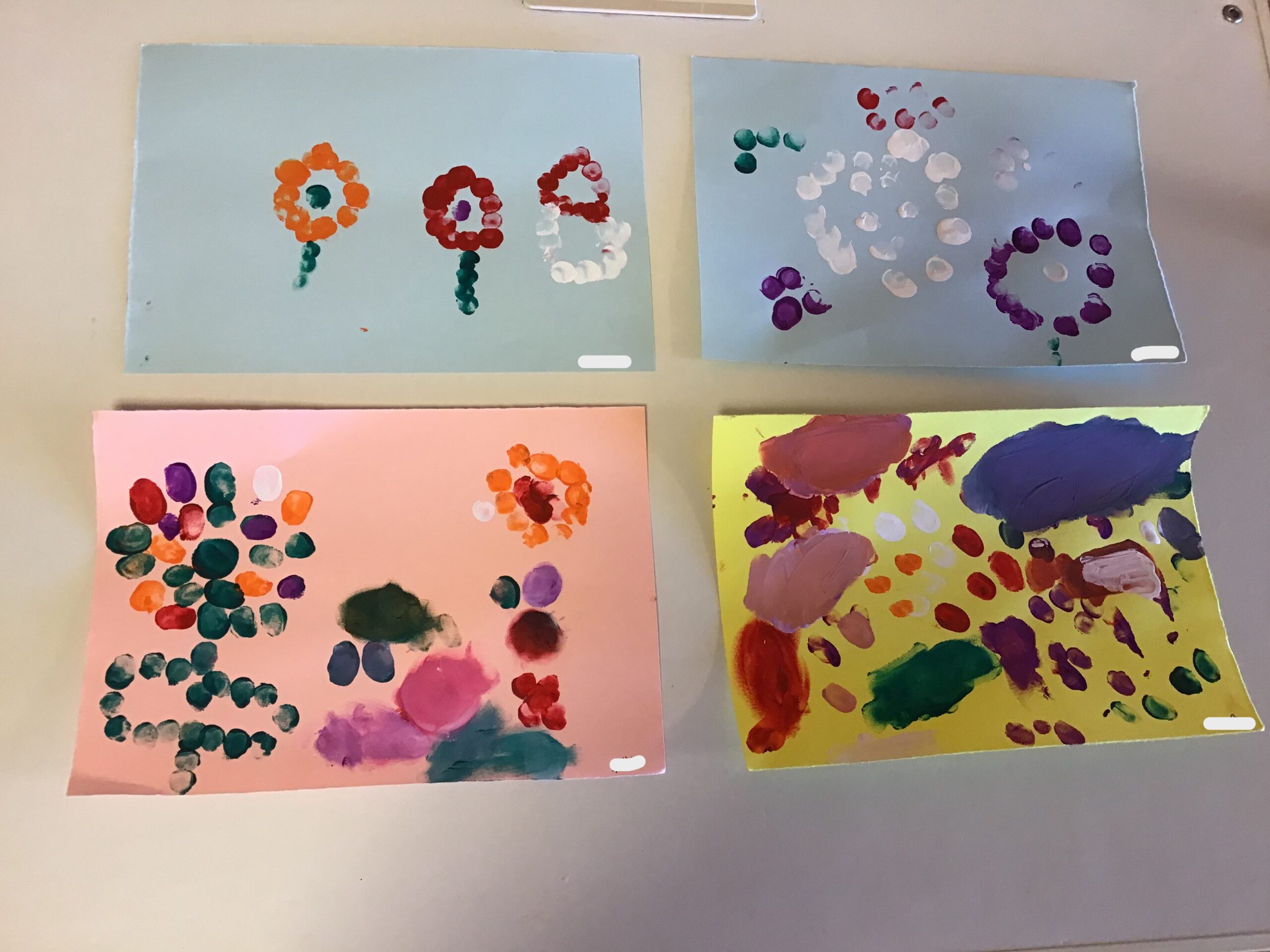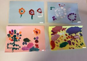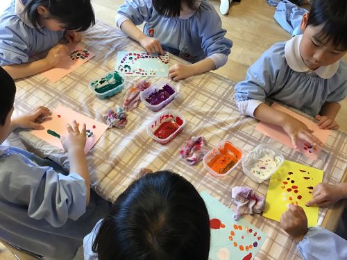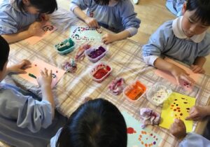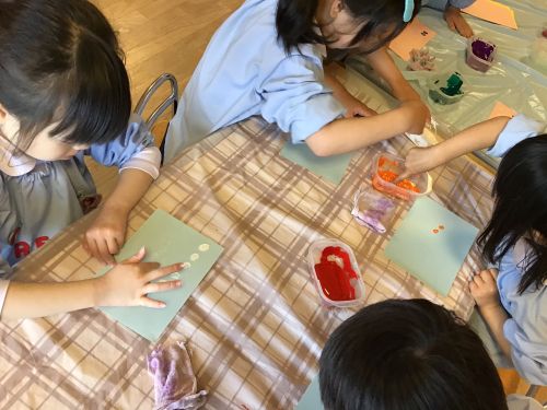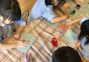 また、4月の月刊誌『しもんのぎもん』を見たこどもたちから、「自分の指紋はどんな形かな?」「絵の具で指紋を出したら面白そう!」などと声が聞かれ、実際にあそびに取り入れてみました。「指紋が見えたよ」「花火を作ってみようかな」などと話しながら個性豊かな作品をいくつも作って楽しんでいました。