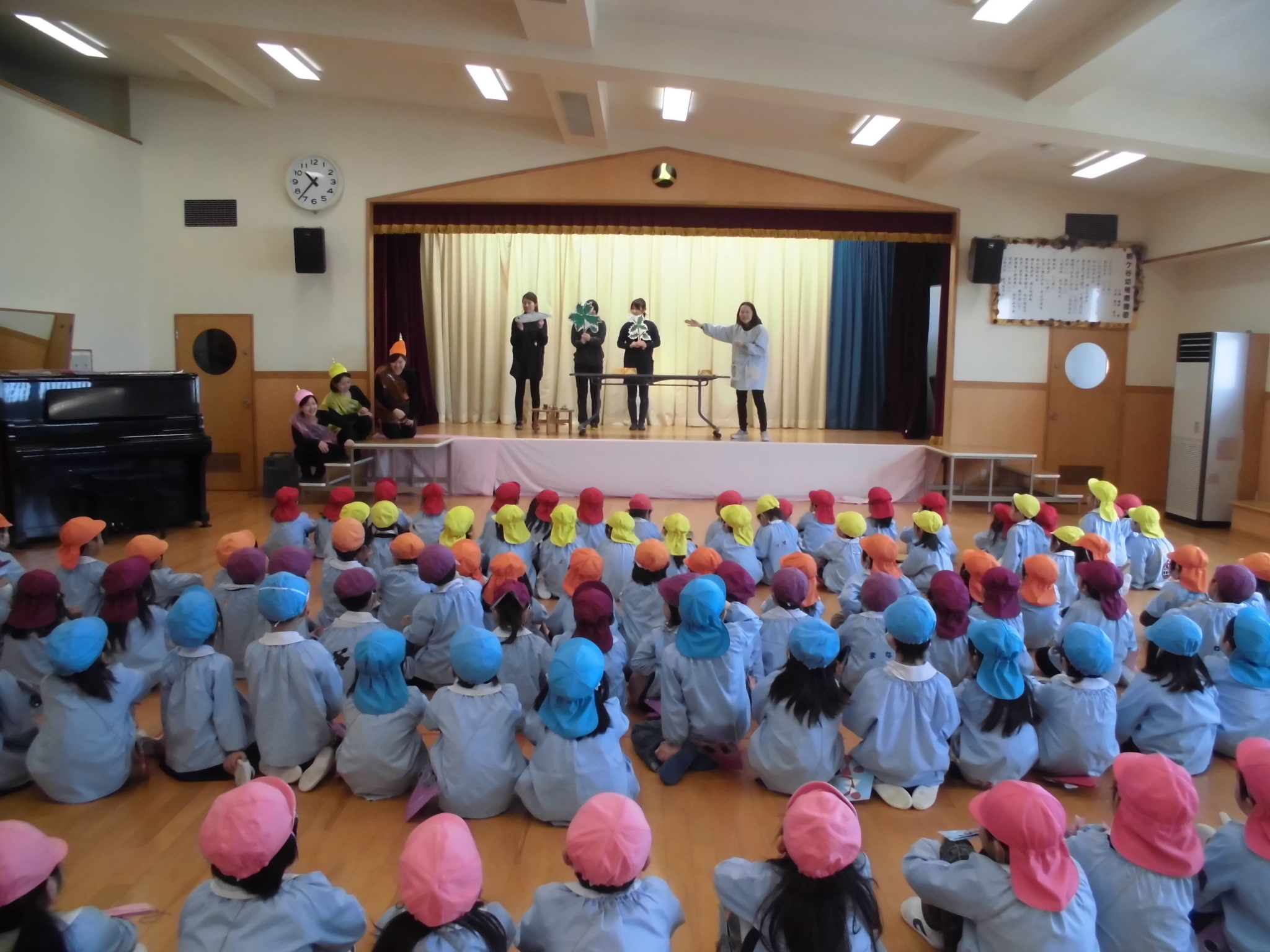 今日は豆まき会を行ないました。節分の由来を先生たちの劇を通して知り、「鬼はそと~!福はうち~!」と大きな声で元気いっぱいに鬼を追い払いました。