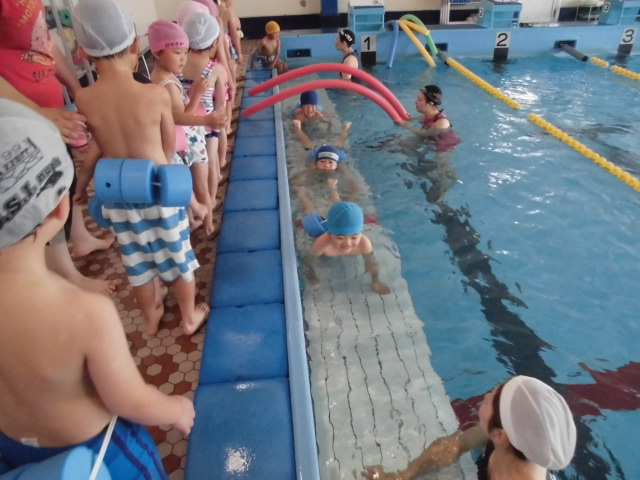 今日はこどもたちが楽しみにしていたJSS南光台スイミングスクールに行って来ました。登園したこどもたちからは「早くプールに行こうよ!」と元気な声が聞こえてきました。プールでは、水に顔をつけたり、ヘルパーをつけて水の中を散歩したりしました。初めは緊張していたこどもたちも、活動が終わると「全部楽しかった!」と嬉しそうに話していました。次回も水に触れる楽しさを味わえるようにしていきます。