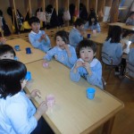 黙祷の後は、非常食として備蓄している乾パンを食べる経験をしました。「ちょっぴりでもおなかいっぱいになったよ」「ビスケットみたいだけど、ちょっと違うね」「僕の家は、お母さんが缶詰も用意してるよ」と、こどもたち同士でも話をしながら、備えの大切さを考えるきっかけとなったようです。この機会にぜひ、ご家庭でも話し合いの機会を設けてみてください。