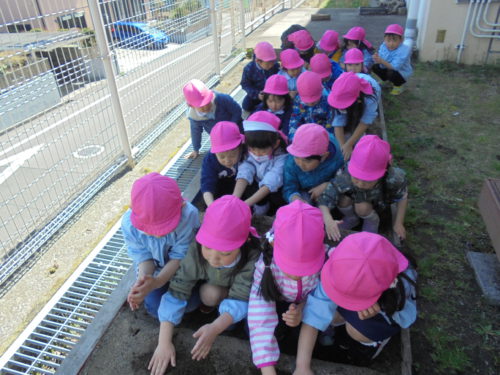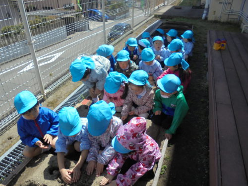鶴ヶ谷幼稚園の年長組で畑にじゃがいもの種いもを植えました。登園してきたこどもたちは「今日はじゃがいも植えられるかな?」ととても楽しみにしている様子でした。実際に種いもを見ると「たくさん芽がでてるね」「一つからたくさんじゃがいもできるの?」と話していました。優しく土をかけて植えた後には、これからの水やりや世話の仕方についても考えて、生長を楽しみにしている姿が見られました。これから年長組みんなで大切に育てていきます!