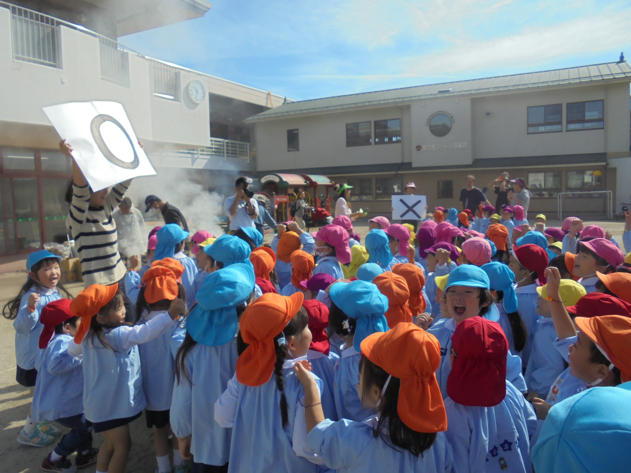 鶴ヶ谷幼稚園で収穫祭を行いました。先日、自分たちで掘ったさつまいもをいただくことを楽しみにしていたこどもたちは、登園してくると「まだ焼きいもしないの?」と待ちきれない様子でした。アルミホイルで包んでドラム缶のなかに入れたあとは、なかよしグループの友達と一緒に、秋の食べ物にまつわる〇×クイズや食べ物運びリレーをして秋の食べ物について知りながら焼き上がりを待ちました。「甘くておいしいね」「あったかいね」と笑顔で焼きいもをいただき、とても楽しい収穫祭となりました。