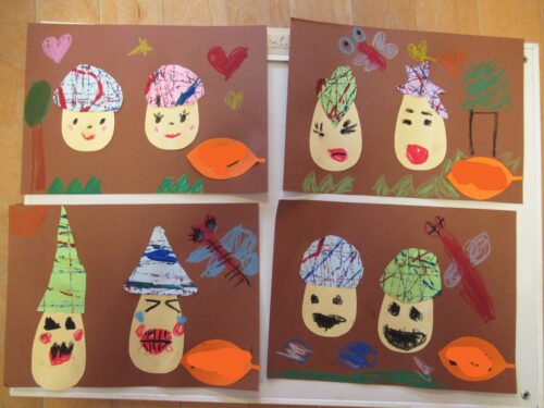 鶴ヶ谷幼稚園の年長組で、2学期の当番表「きのこ」を製作しました。かさの部分はビー玉…
