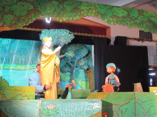 鶴ヶ谷幼稚園で、劇団すぎのこさんの人形劇「みにくいあひるの子」「金のおの、銀のおの…