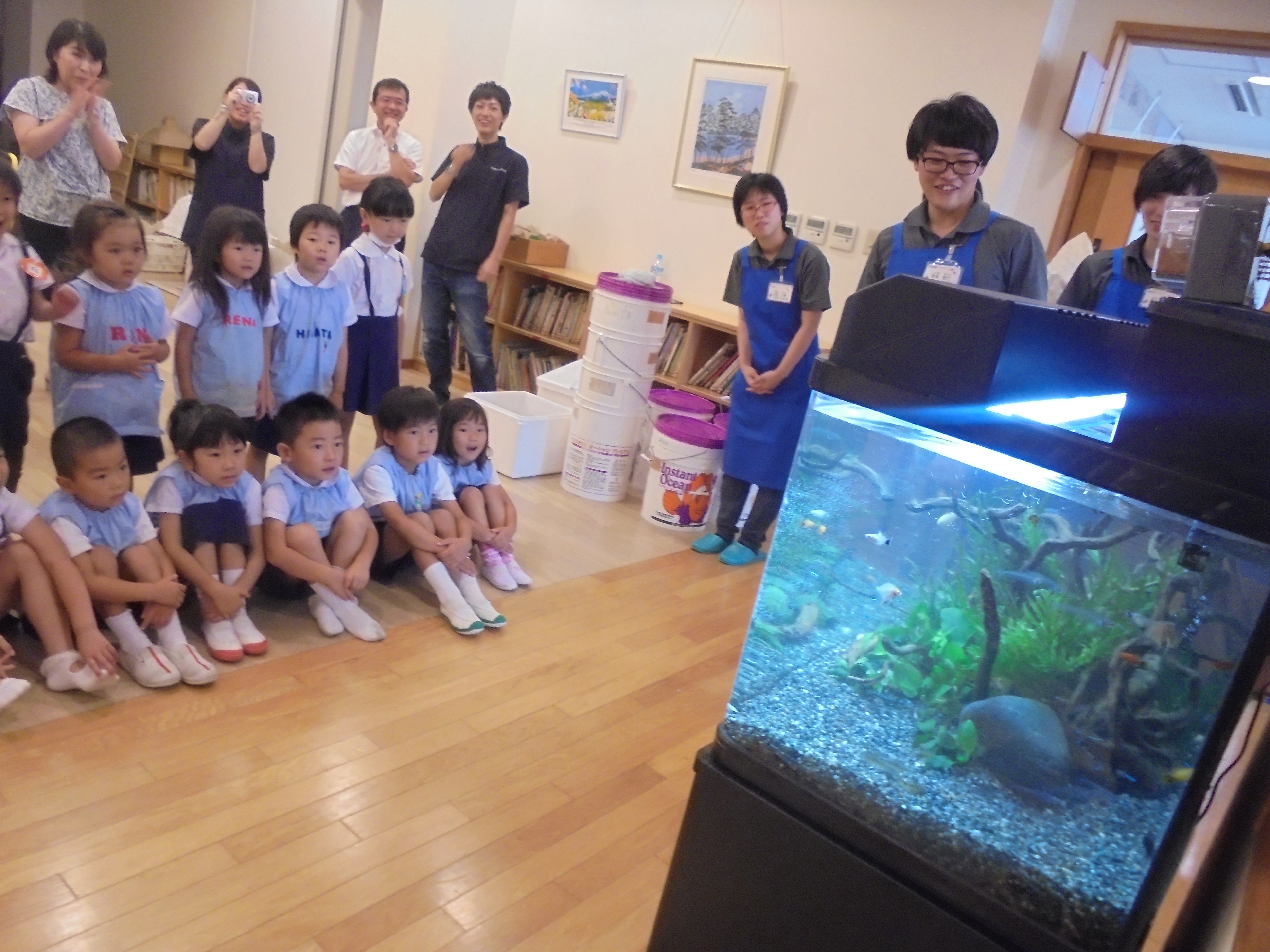 鶴ケ谷幼稚園に、熱帯魚が仲間入りしました‼仙台総合ペット専門学校・飼育管理科アクアコースの学生の皆さんに設置していただきました。その様子をスイングのこどもたちが、「お魚かわいいね!」「たくさんのお魚が泳いでいるね!」と目を輝かせて見ていました。職員室前の大きな水槽で泳ぐ熱帯魚の様子を明日からこどもたちと観察し、大切にしていきます。