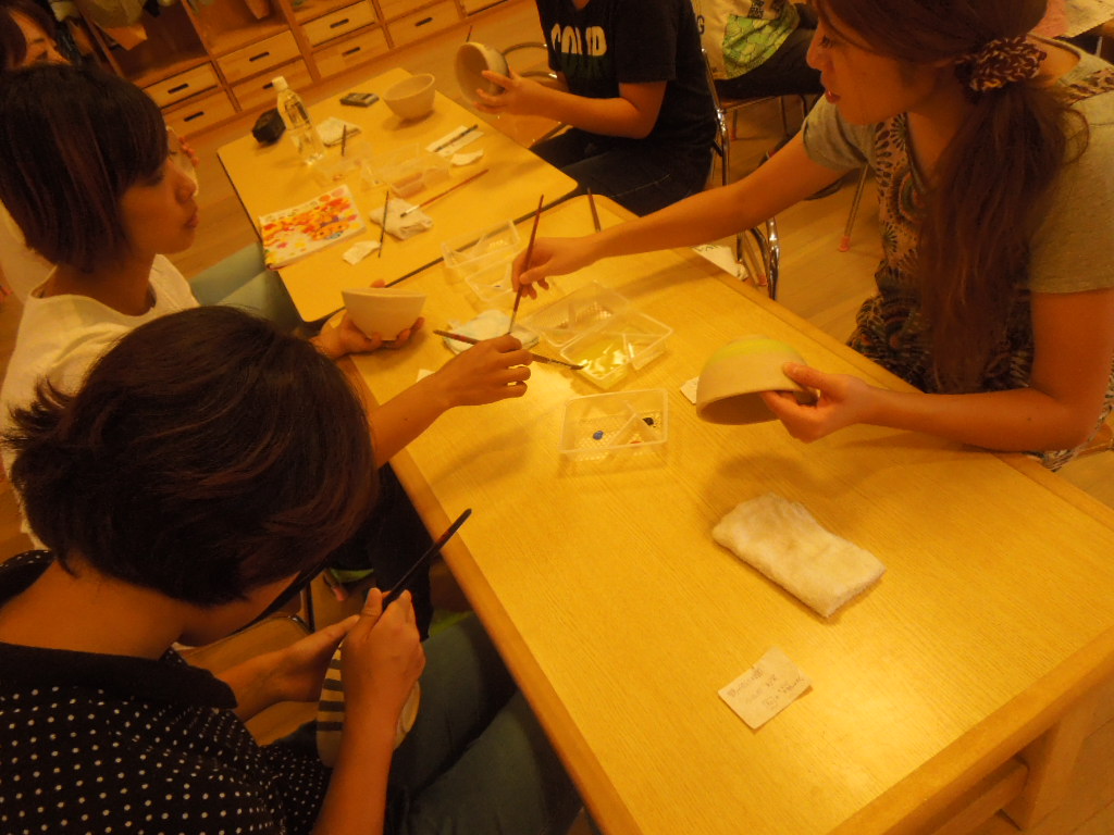 以前、ろくろを回しながら作った茶碗が焼き上がり、今回は絵付けを行いました。